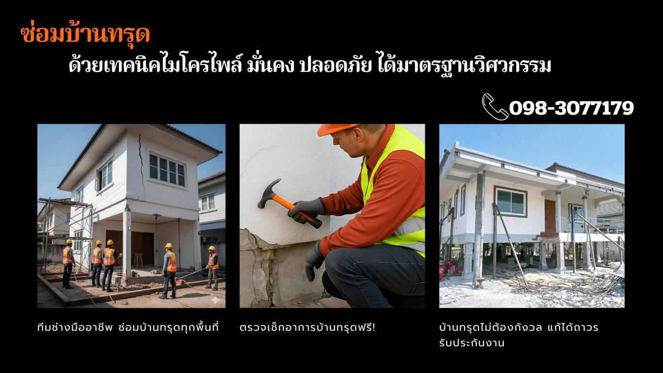 - รับแก้บ้านทรุด: ไม่ว่าปัญหาจะเล็กหรือใหญ่ เราพร้อม รับแก้บ้านทรุด ให้กลับมามั่นคง ปลอดภัย เหมือนใหม่ ด้วยวัสดุคุณภาพสูงและรับประกันผลงาน