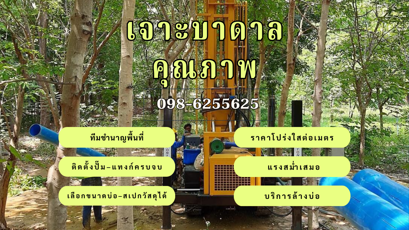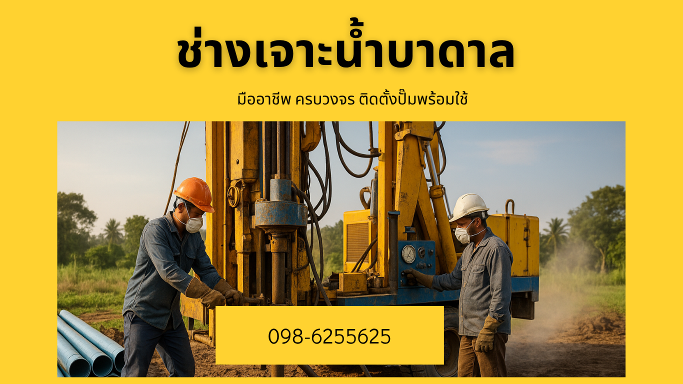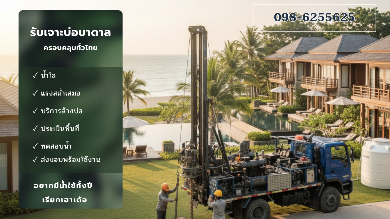 | 4 นิ้ว | บ้านพัก/น้ำใช้ทั่วไป | 1,200–1,800 | รวมค่าเจาะ ยังไม่รวมท่อกรุ/สแลท/ทราย/ปั๊ม |